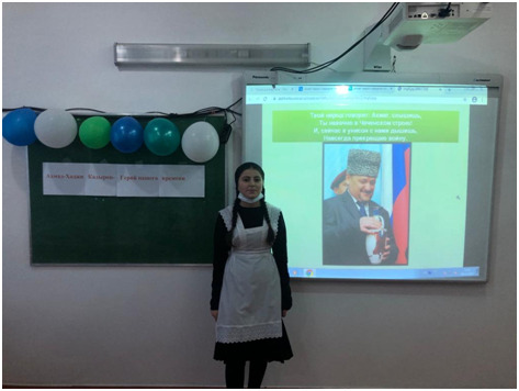 В 8 «Б» классе классным руководителем Эскиевой М.Р. был проеден классный час на тему: «Ахмад-Хаджи Кадыров-Герой нашего времени».
