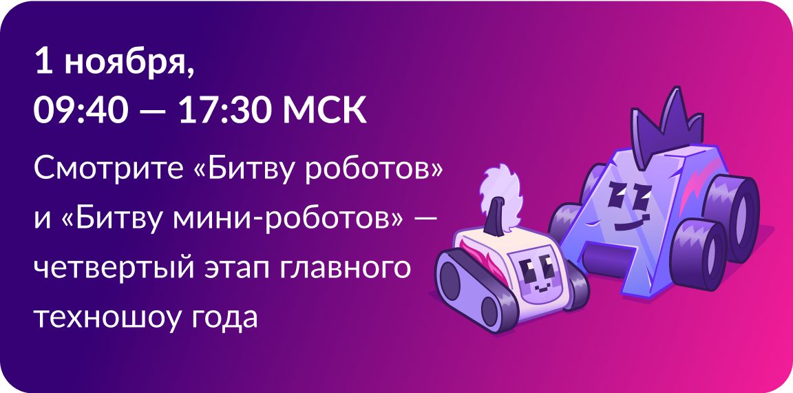 27.10.2025Минцифры России в соответствии с распоряжением Правительства Российской Федерации от 11 апреля 2023 г. No 889-р сообщает о проведении четвертого отборочного этапа Международного чемпионата по битве роботов сезона 2025 года (далее - Чемпионат, мероприятие). Цель Чемпионата - популяризация в Российской Федерации инженерной мысли как драйвера развития и поддержки современных цифровых технологий.В четвертом отборочном этапе Чемпионата сразятся 28 команд из России, Беларуси, Индии и Китая: 16 команд в рамках дисциплины «Битва роботов» в весовой категории до 110 килограмм и 12 команд в рамках дисциплины «Битва мини-роботов» в весовой категории до 1,5 килограмм. Среди участников - команды МТУСИ, СПбГУТ им. М.А. Бонч-Бруевича, Высшей Школы Нефти, МИСИС, ИТМО, СПбПУ Петра Великого, ДГТУ, МИРЭА, НГТУ НЭТИ и других ведущих университетов.Мероприятие пройдет 1 ноября 2025 г. с 11:30 до 19:30 (по местному времени) при поддержке Правительства Свердловской области на территории Международного выставочного центра «Екатеринбург-ЭКСПО» по адресу: Свердловская область, г. Екатеринбург, ЭКСПО-бульвар, д. 2. Программой мероприятия предусмотрено два шоу: дневное (с 13:00 до 14:30) и вечернее (с 18:00 до 19:30).
